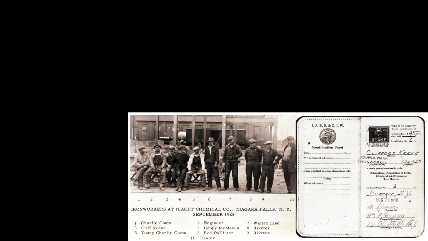 Ironworkers at Niacet Chemical Company, Niagara Falls, New York, 1928; Cliff Keene second from left. 1929 union card, International Association of Bridge, Ornamental, and Structural Ironworkers. Images courtesy Steve Gilford, from the personal collection of Clifford Keene.