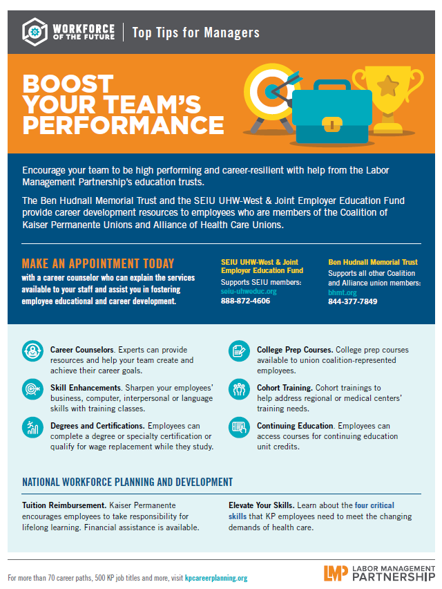 TOOLS Boost Your Team's Performance Share Tweet Email Format:PDFSize:8.5" x 11"Intended audience:Frontline managersBest used:Use this guide to understand the services available to your staff and foster employee educational and career development.Related tools: Prepare Today for the Jobs of the Future Workforce of the Future Facilitator's Guide Manager’s Guide to Workforce Development Workforce of the Future Conversation Toolkit Critical Skills Toolkit Download PDF 129 people found this helpful. Was it helpful to you? YesNo