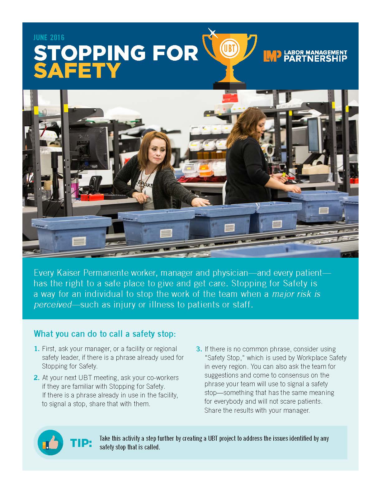 Best used: This flier highlights the June 2016 topic for champions to share with their team. To introduce your team to the practice of "Stopping for Safety"—a way for any team member to prevent injuries.