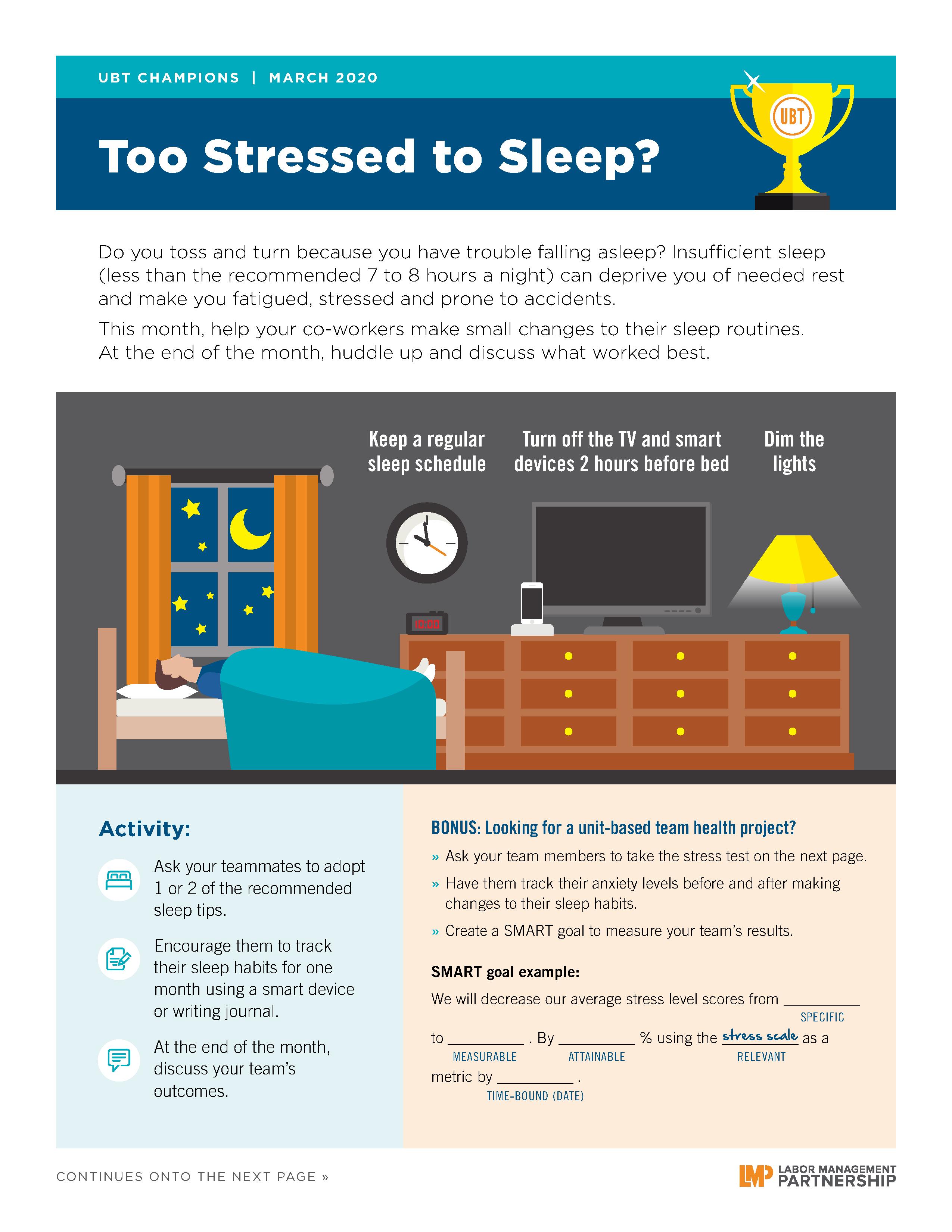 TOOLS Health and Safety Champions — March 2020 Focus Share Tweet Email Format:PDFSize:Two pages, 8.5" x 11"Intended audience:UBT health and safety championsBest used:Help your teammates reduce stress and improve their sleep habits.Related tools: Health and Safety Champions — February 2020 Focus Health and Safety Champions — August 2020 Focus Health and Safety Champions — November 2020 Focus Health and Safety Champions — June 2020 Focus Health and Safety Champions — February 2021 Focus Download PDF 90 people found this helpful. Was it helpful to you? YesNo