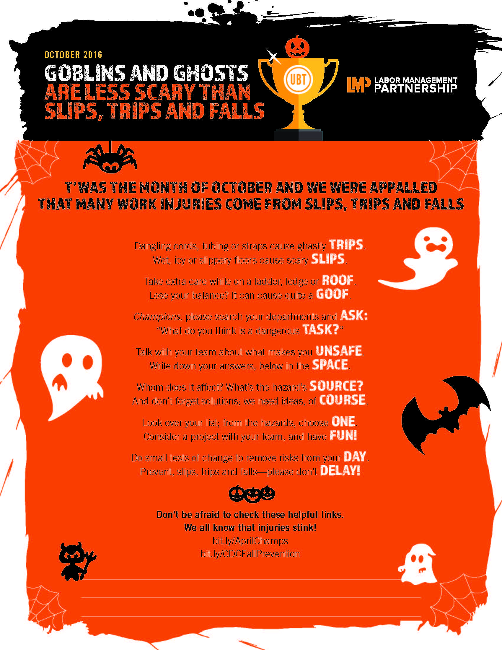 This flier uses a Halloween theme for champions to help their teams identify and eliminate hazards that cause slips, trips and falls in the workplace.