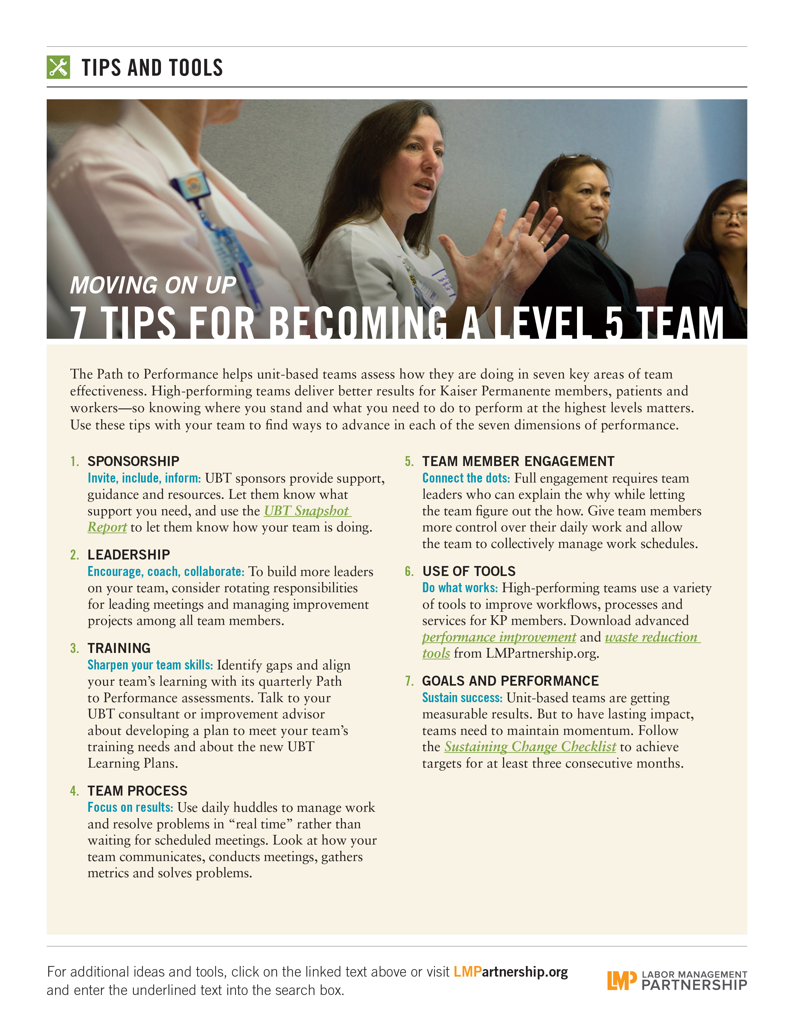 This tipsheet suggests ways teams can reach Level 4 or Level 5 in each dimension of the Path to Performance. Post on bulletin boards and discuss in team meetings; use these tips to engage your team in specific actions.