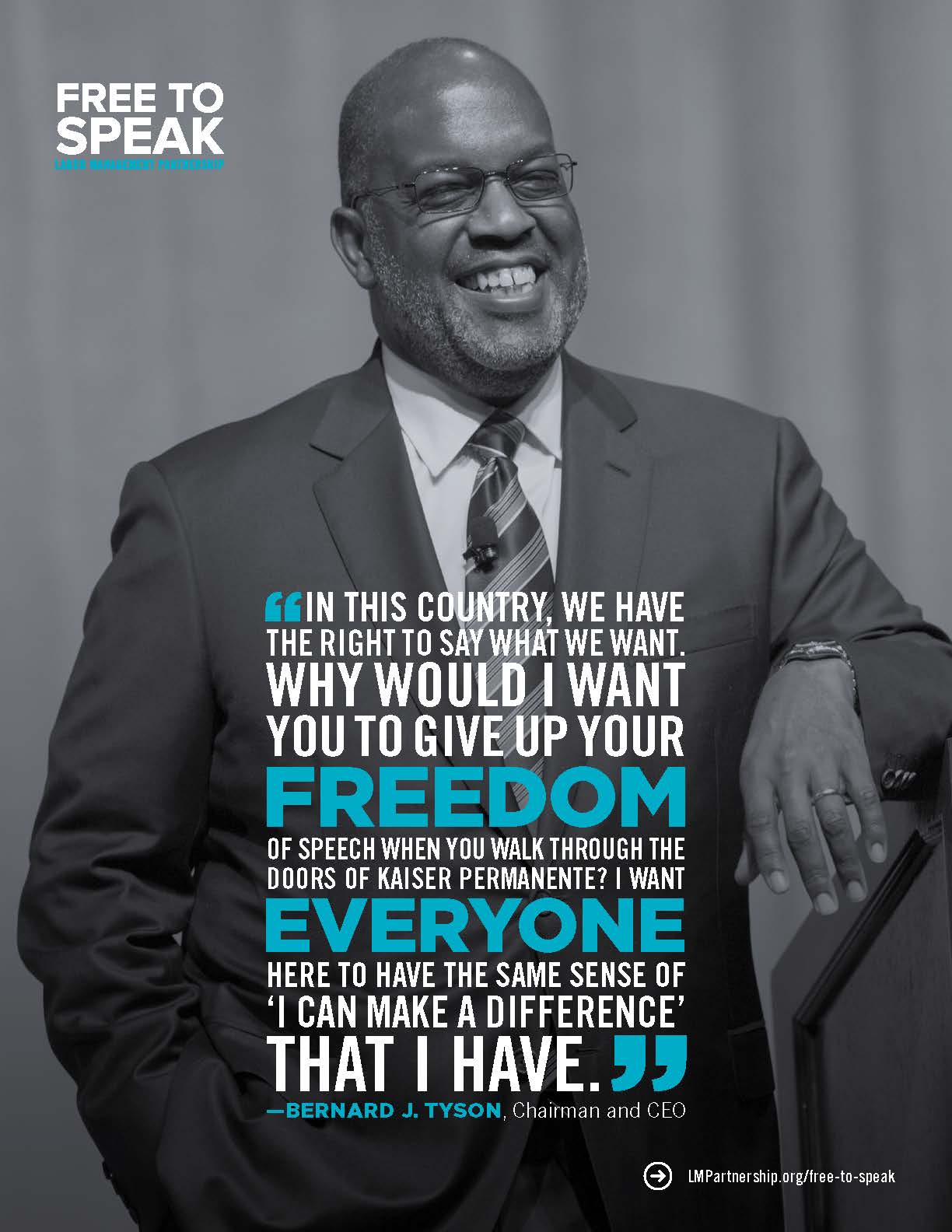 Bernard J. Tyson, former CEO and chairman of Kaiser Permanente addresses our #FreeToSpeak culture in this poster for bulletin boards, break rooms and other staff areas.