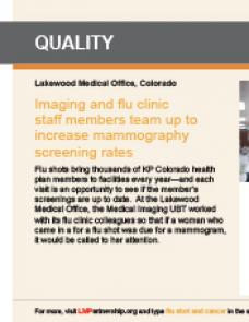 This PowerPoint features a Colorado Medical Imaging UBT at Lakewood Medical Center that worked with its flu clinic colleagues to bring attention to members who were due for a mammography screening. Use in presentations to show some of the methods used and the measurable results being achieved by unit-based teams across Kaiser Permanente.