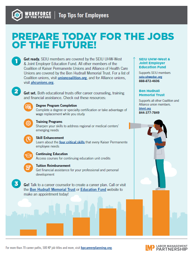 TOOLS Prepare Today for the Jobs of the Future Share Tweet Email Format:PDFSize:8.5" x 11"Intended audience:Frontline employeesBest used:Use this handy resource guide to find the skills and training that you need to jumpstart your career. Related tools: Boost Your Team's Performance Advance Your KP Career Workforce of the Future Conversation Toolkit Workforce of the Future Facilitator's Guide Manager’s Guide to Workforce Development Download PDF 147 people found this helpful. Was it helpful to you? YesNo