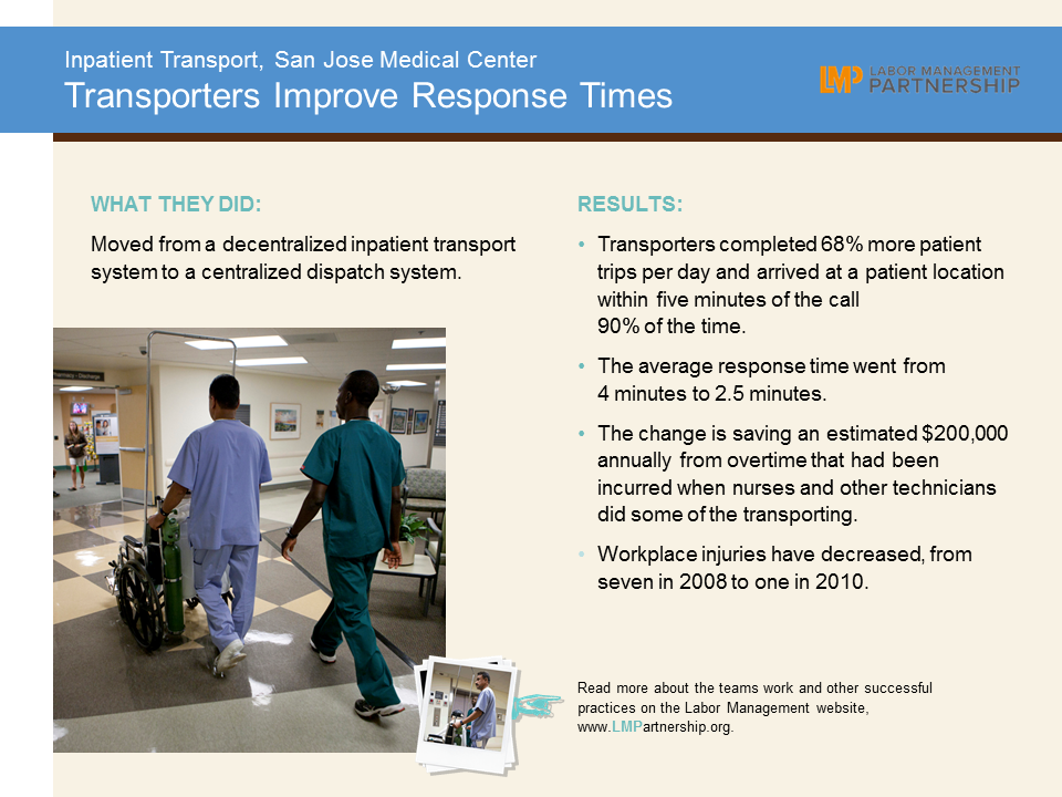 This one-page slide showing how an inpatient transport team in San Jose, CA reduced tranport times through a centralized dispatch system. Include in meetings or presentations as an example of UBT performance improvement in Northern California.