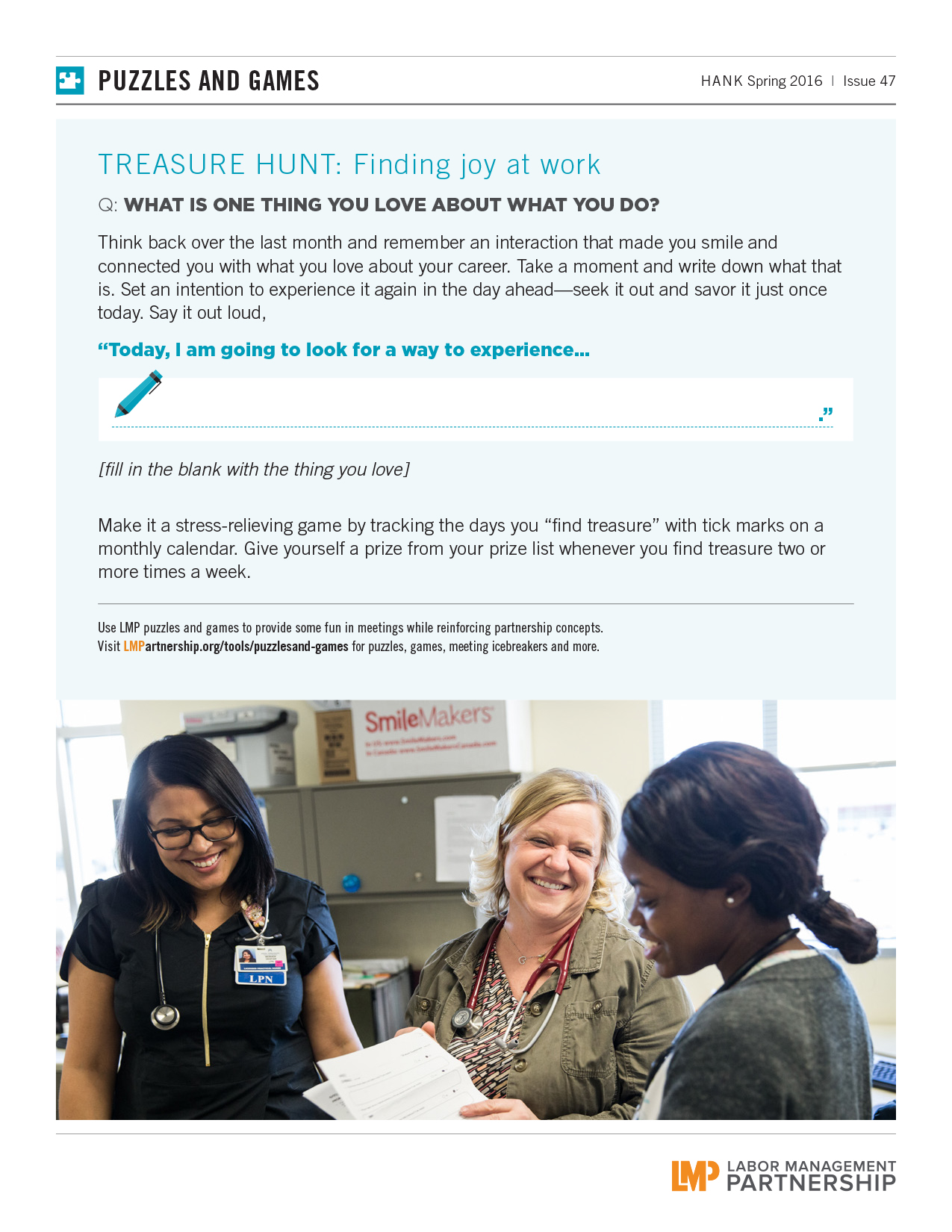 TOOLS Treasure Hunt: Finding Joy at Work Share Tweet Email Format:PDFSize:8.5" x 11" Intended audience:Frontline employees, managers and physiciansBest used:Use this treasure hunt to reflect on moments of joy at work.Related tools: Puzzle and Games: You're a Winner Crossword: All Work, No Play Poster: Half-Empty, Half-Full Infographic: Taming the Stress Monster Hank Spring 2016 Download PDF 131 people found this helpful. Was it helpful to you? YesNo